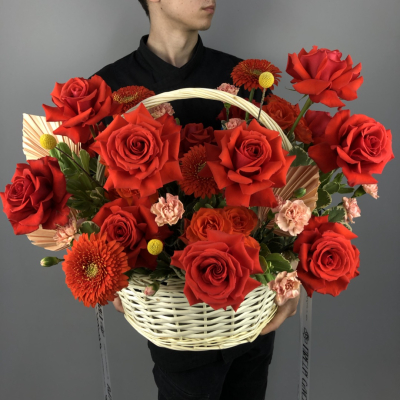 —Алая композиция из роз в корзине