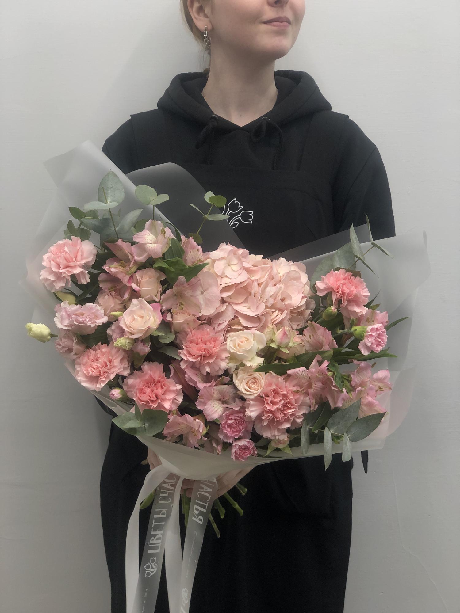 Альстромерия, Гвоздика кустовая, Гвоздика одноголовая, Гортензия, Эустома, Роза кустовая, Эвкалипт