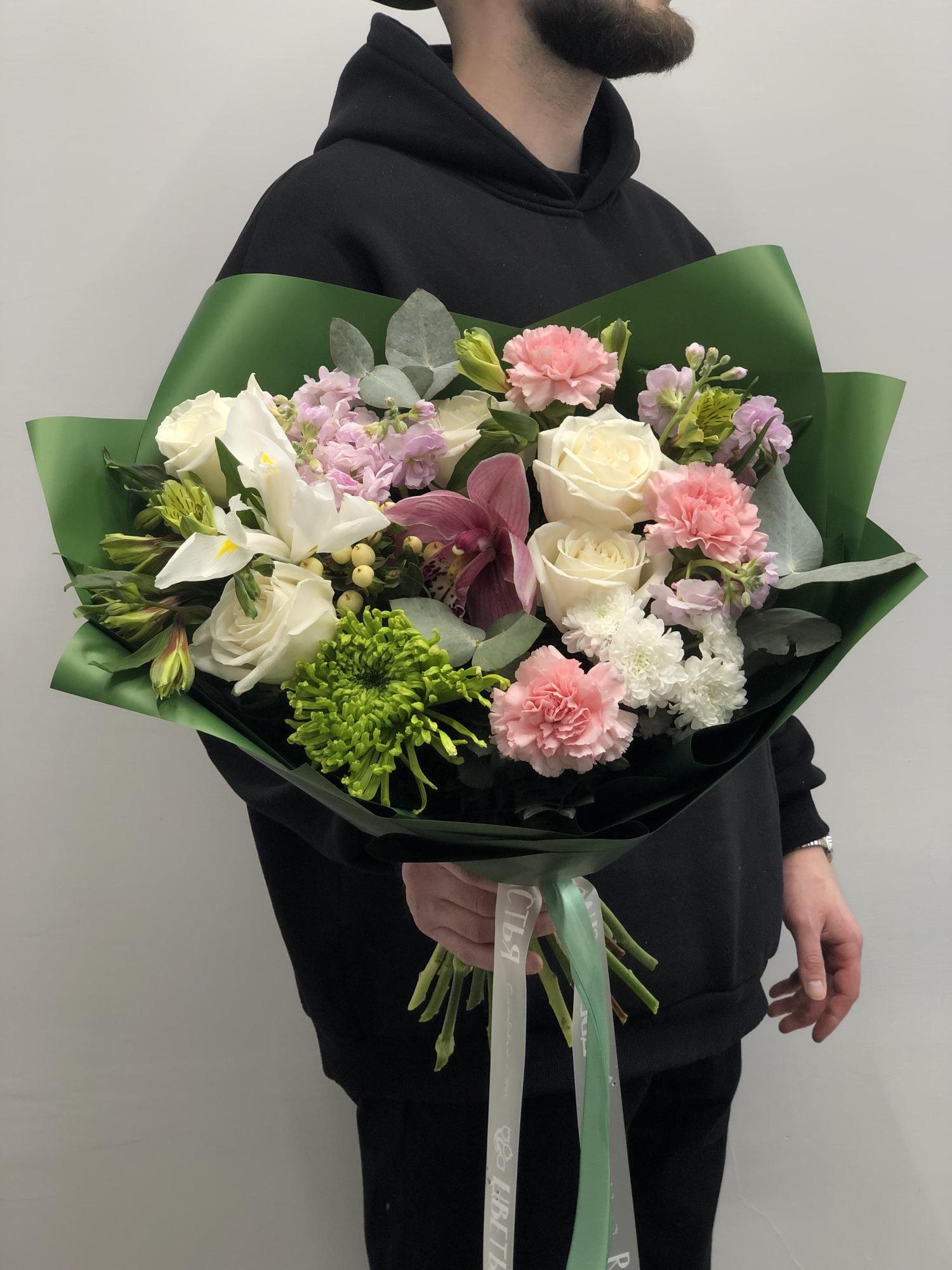 Альстромерия, Гвоздика, Гиперикум, Ирис, Маттиола, Орхидея, Роза Эквадор, Хризантема одноголовая, Хризантема кустовая, Эвкалипт