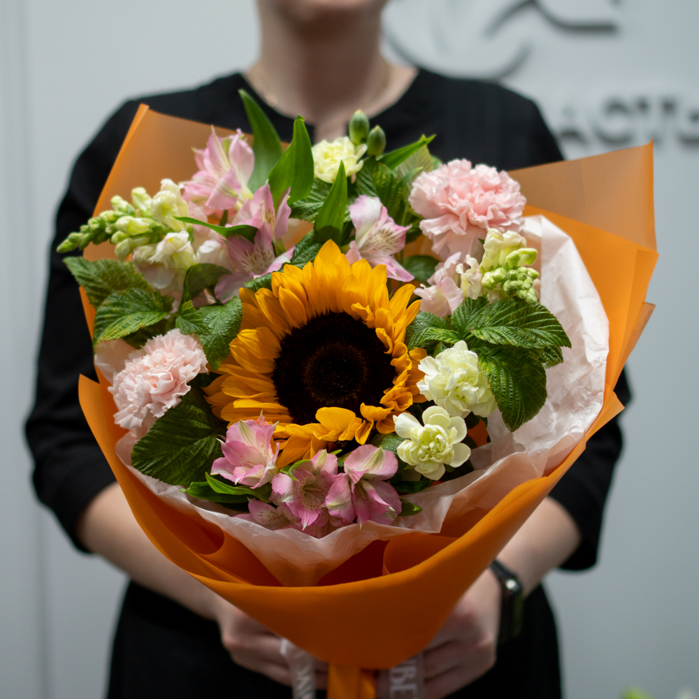 Подсолнух, Альстромерия, Гвоздика кустовая, Антирринум, Малина, Гвоздика одноголовая