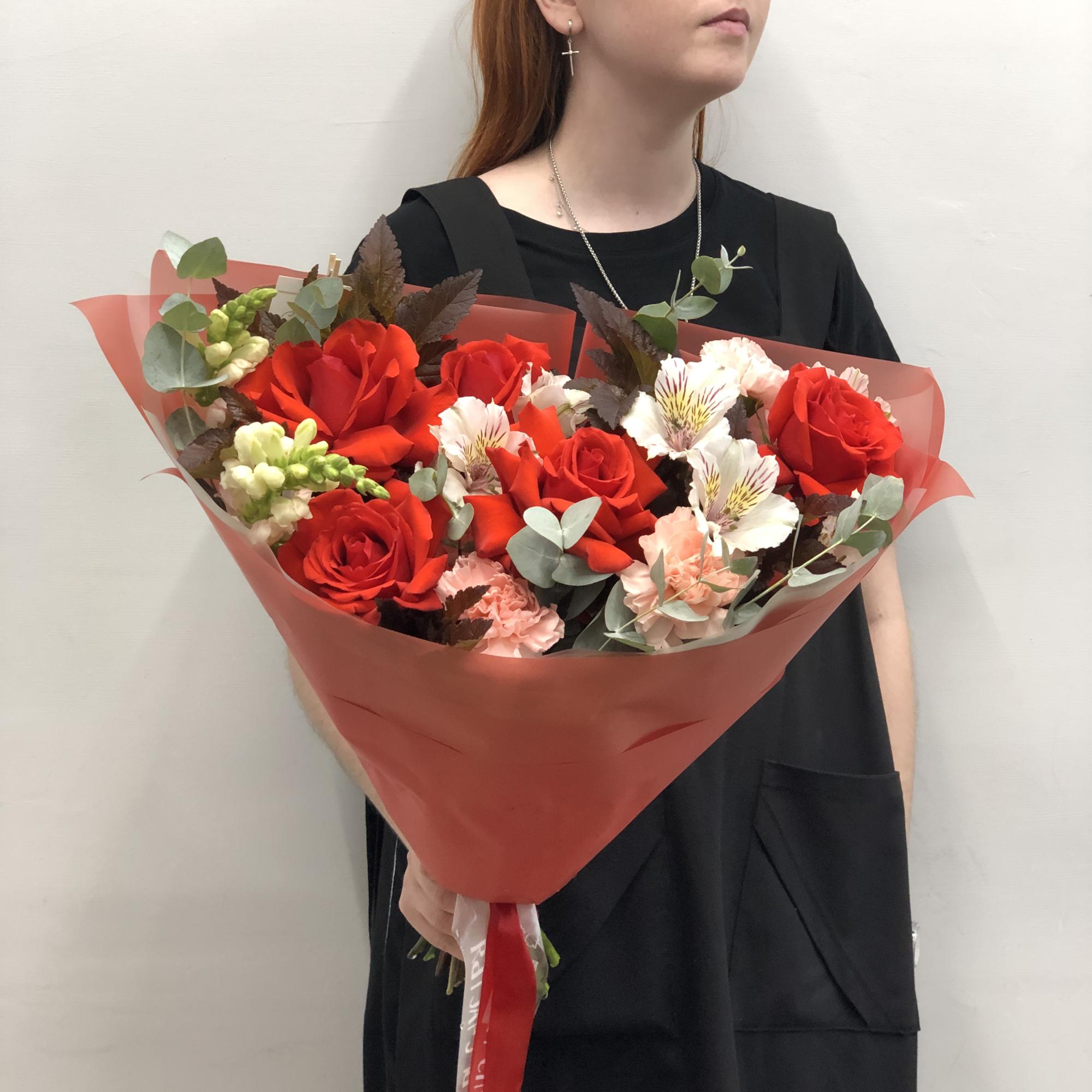 Роза Эквадор, Антирринум, Альстромерия, Гвоздика, Эвкалипт, Малина